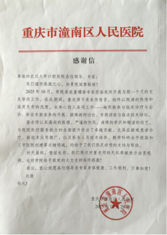 2025年10月,我院范湖院区正畸医生董耀誉志愿参加中华口腔医学会组织的“口腔健康促进与口腔医学发展西部行”公益活动,怀着对医学事业的赤诚之心与对西部群众的关切之情,奔赴重庆市潼南区人民开云官网入口app ,开展了为期一个月的医疗支援服务。